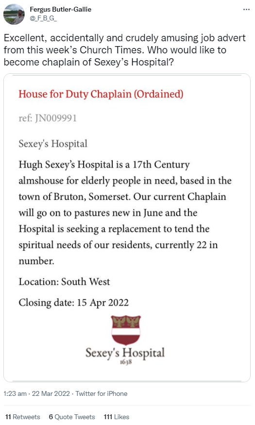 Guardian contributor Fergus Butler-Gallie also happens to be the priest on Twitter who drew my attention to this job ad for “chaplain of Sexey’s Hospital”. I obviously now follow him on the platform.