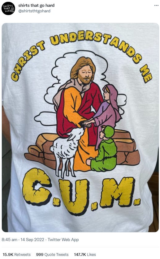 The @shirtsthatgohard Twitter account is such a gold mine for weird religion content.