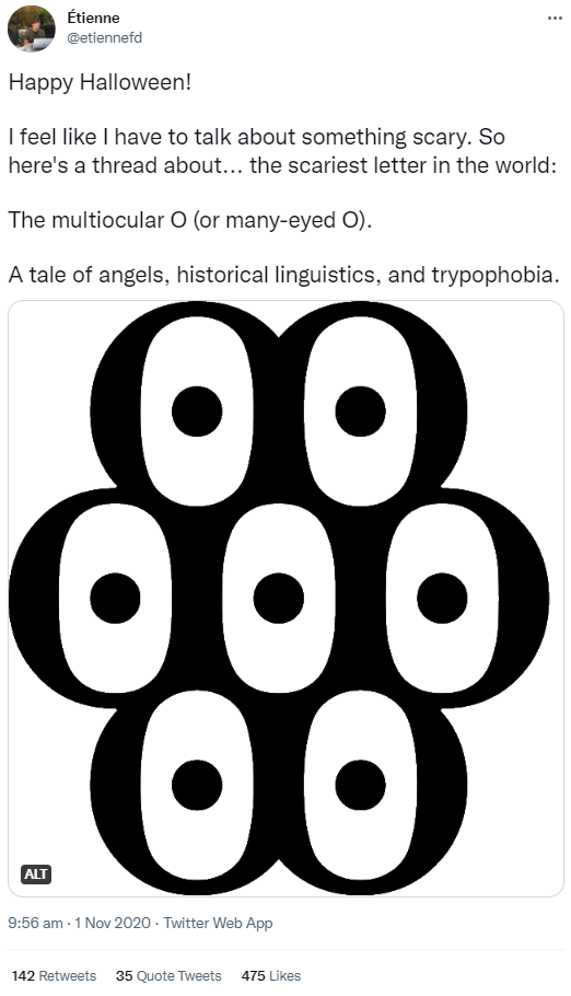 This great tweet thread is two years old but I guess I saw it this week because Halloween is coming up. This glyph is called a Multiocular O and appears just once in all of written history, in a translation of the book of Psalms which, unsurprisingly, describes a seraphim in Old Church Slavonic.
