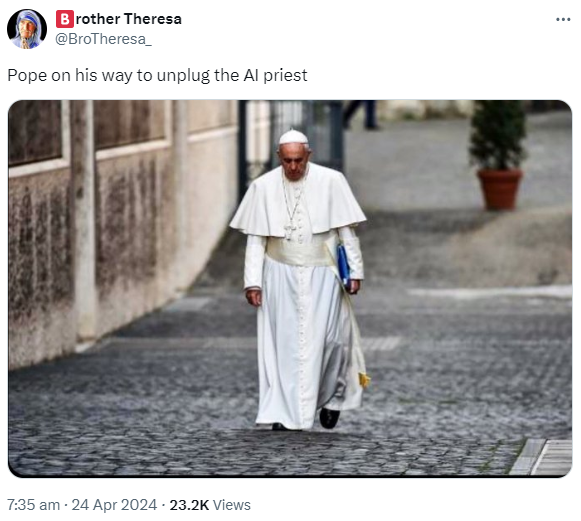 Robot priests aside, the Vatican is extremely interested in what happens with AI. You might recall my radio report about the Rome Call for AI Ethics on the Religion and Ethics Report. The Rome Call actually took place in 2020, with Jewish and Muslim representatives also signing onto the call in 2023.