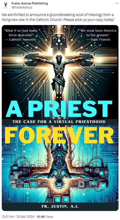 The (mostly negative) social media response was almost immediate. We can ordain an AI but not a woman? What if we ordained Clippy instead? Satirical Catholic publishing company Frater Asinus Publishing also released a(n AI generated) book cover for a book by Father Justin.