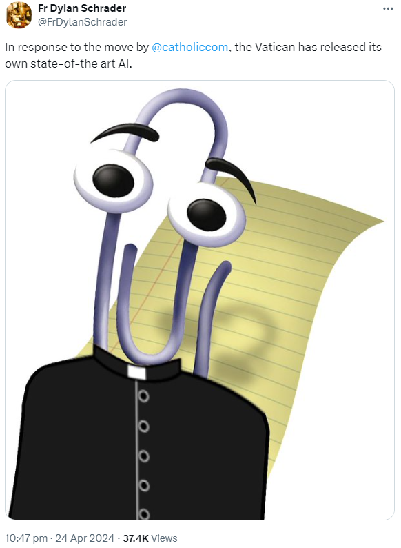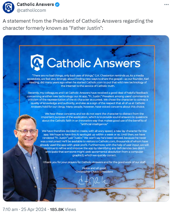 I have not played around with the Father Justin bot, but the project kind of reminds me of the Magisterium AI program that was trained on a database of Church documents as a way to help answer questions in line with Catholic doctrine (and I assume, no Gatorade baptisms). But nobody was trying to anthropomorphise Magisterium AI, whereas Father Justin was designed to be an approachable face to the church.