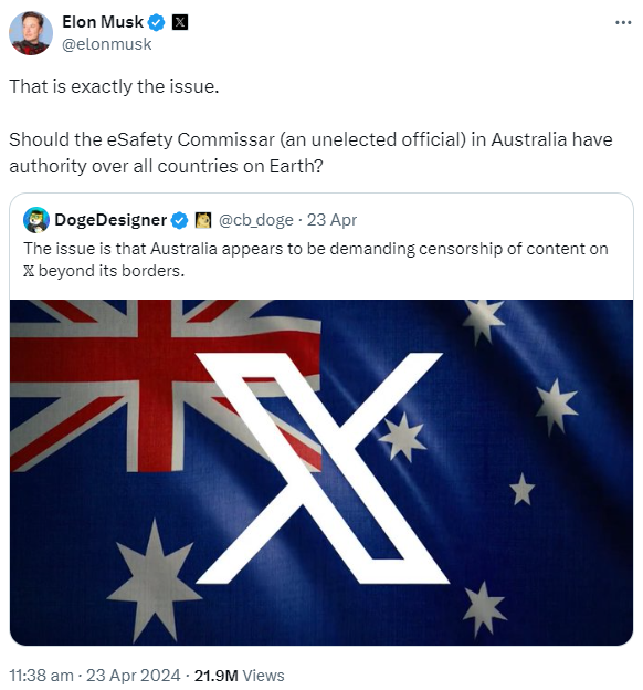 Video of the incident circulated online, and Australia's eSafety commissioner ordered it be removed from the internet – not just in Australia, but worldwide. Most platforms voluntarily complied, but Elon Musk refused to take the video down for free speech reasons, arguing that no single country should be allowed to dictate what can appear online. Australian politicians weren't impressed.