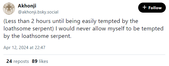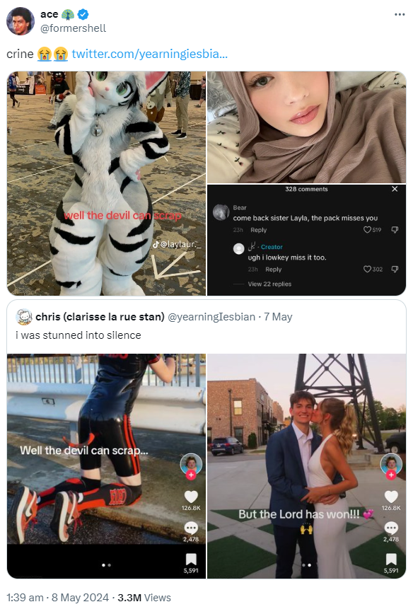 This quote from the 2022 song "Revival" by Zach Bryan is getting used on TikTok/X/etc in reference to people who have left the furry or kink communities to become religious. (Thanks to Andrew for sending this to me.) In addition to this one, Travis sent me a now-private video on TikTok of a gay pup who joined the Church of Jesus Christ of Latter-day Saints.