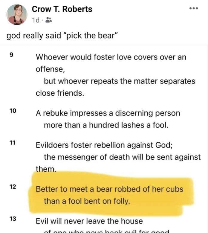Everyone's been arguing online about whether you'd rather be caught in the woods with a strange man or a bear. Many women have chosen the bear, and the book of Proverbs has the definitive answer.
