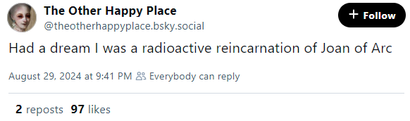 Chappell Roan's performance of Good Luck, Babe at the 2024 VMAs was cool as hell and added more weight to the argument that female pop stars deserve swords. The queer, religious, feminist themes scream Joan of Arc. Here's a good analysis.