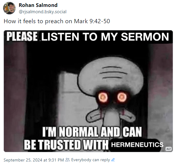 Not very Modern Relics-coded but I thought I’d post it here anyway. A few weeks ago I delivered a sermon to my congregation here in Sydney. The reading that week was Mark 9:42-50 which, honestly, kind of sucks lol. It might be the most difficult thing I’ve ever written, but I’m proud of how it turned out.
