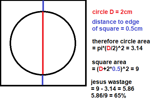 In response to last week’s post about Irish nuns making altar bread, reader Luke has written in saying, “I calculate (conservatively) that those nuns are wasting Jesus' body to the tune of 65% by not adopting a square wafer system.” He has helpfully included his working: