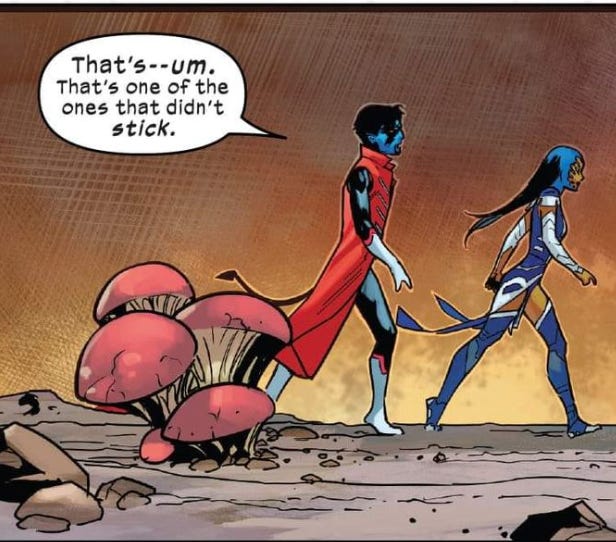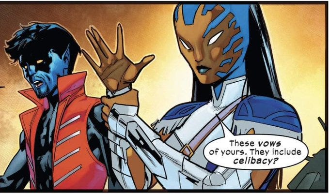Despite that, this week Relevant Magazine Senior Editor Tyler Huckabee posted these panels from the latest X-Men series Legion of X, where it is revealed that Nightcrawler fucks. “my brave boy is deconstructing,” Tyler says.