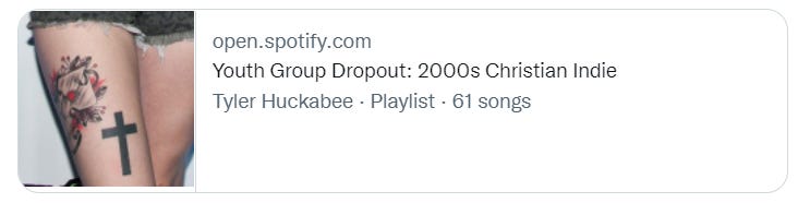 Much of this edition was written to Tyler Huckabee’s Spotify playlist of “2000s indie and emo jams by Christian/formerly Christian/Not Christian but not NOT Christian bands that forged the millennial deconstructing/exvangelical set.”