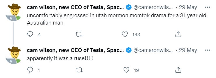 Some TikTokers are claiming that Taylor just had a regular affair and the whole swingers story is a cover (thanks to Cam for sending me the linked screenshot). But Taylor Frankie Paul has a history of making wild statements as a way to increase engagement, like when she joked she was really 50 years old and the mother of two of her friends. It’s entirely possible that she and her husband are just moving house and the divorce and swingers story is purely so people like me will talk about her and funnel more eyeballs to her TikTok account (although to be clear, other members of the MomTok group are telling the same story and it would be socially devastating in mainstream Latter-day Saint circles).