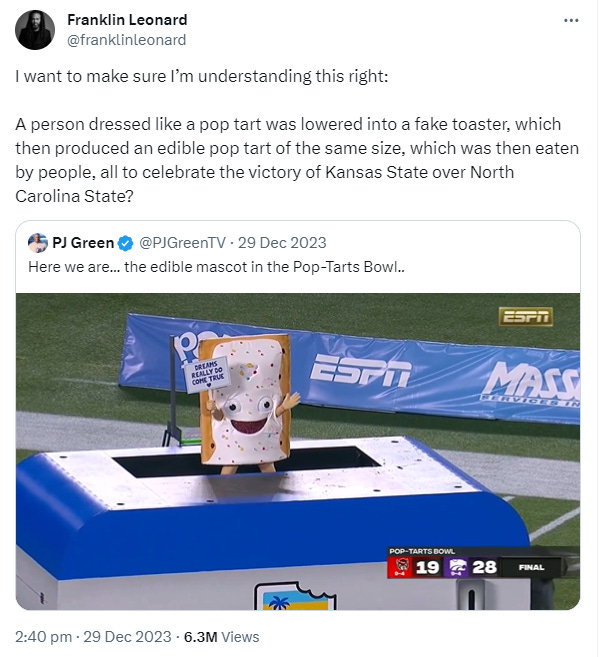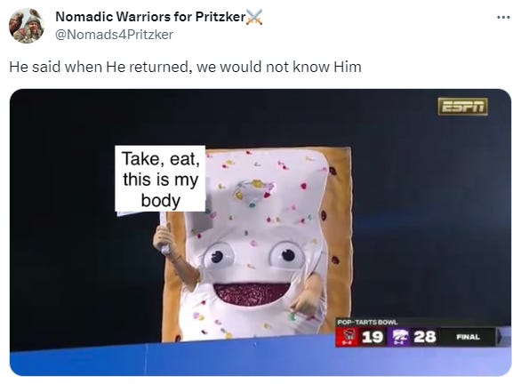 There were a lot of memes that happened while I was away. For example, at an event called the "Pop-Tarts Bowl" an anthropomorphised Pop-Tart slid into a toaster while holding a sign saying "Dreams really do come true" and then it came out as a big cooked Pop-Tart and a lot of footballers gathered around and ate the Pop-Tart.
