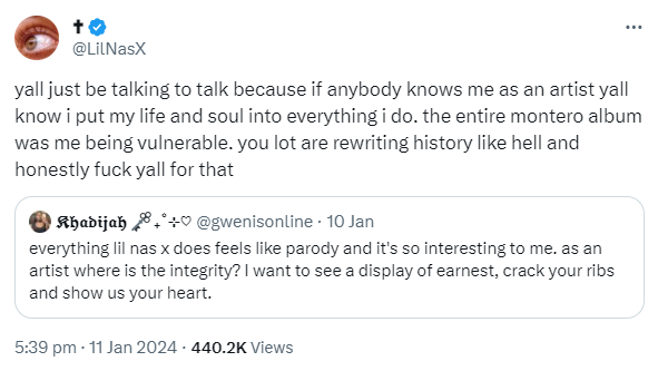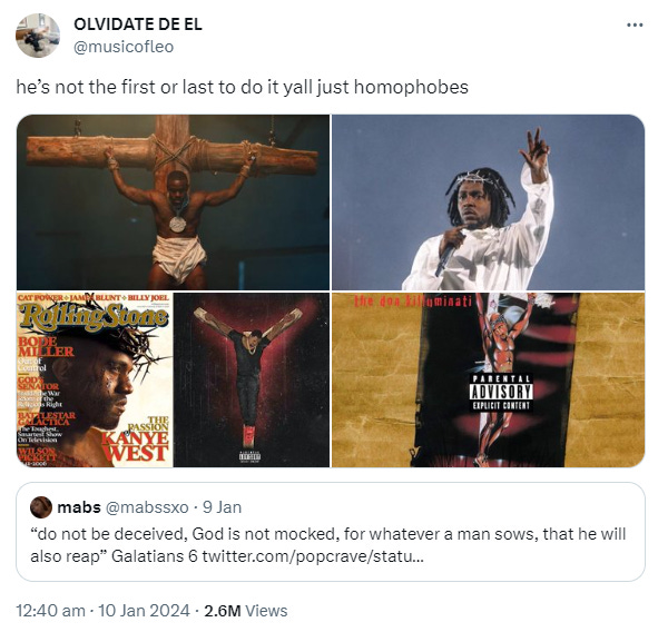His TikTok comments are flooded with people accusing him of blasphemy. Lil Nas X is clapping back on Twitter/X, defending his choices and retweeting posts pointing out that black artists use biblical imagery all the time. Remember Yeezus?