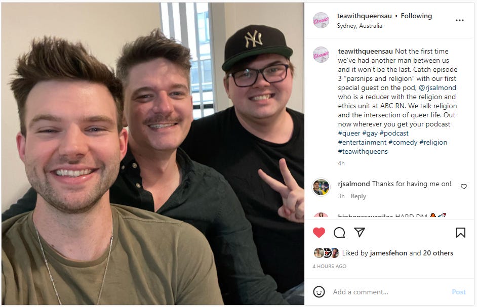 Before I get to the (maybe) last batch of posts and my little retrospective, I want to announce that I was a special guest on the Tea With Queens podcast! I spoke with Dizzy Bility (aka Petey Walter) and Nick Summerfield about the intersection of religion and queer life, and also how Dizzy exposed my secret relationship with my housemate (who is now my fiance).