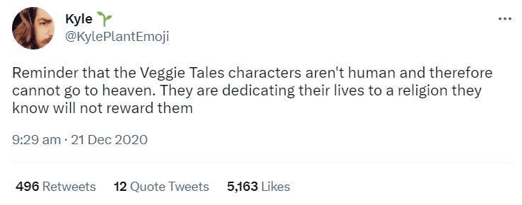 Note that I’m not counting the Netflix series VeggieTales in the House/City as canon, because it is an abomination and the character design is completely different. It’s possible that the newer The VeggieTales Show has returned to canon but I’ve never watched it.