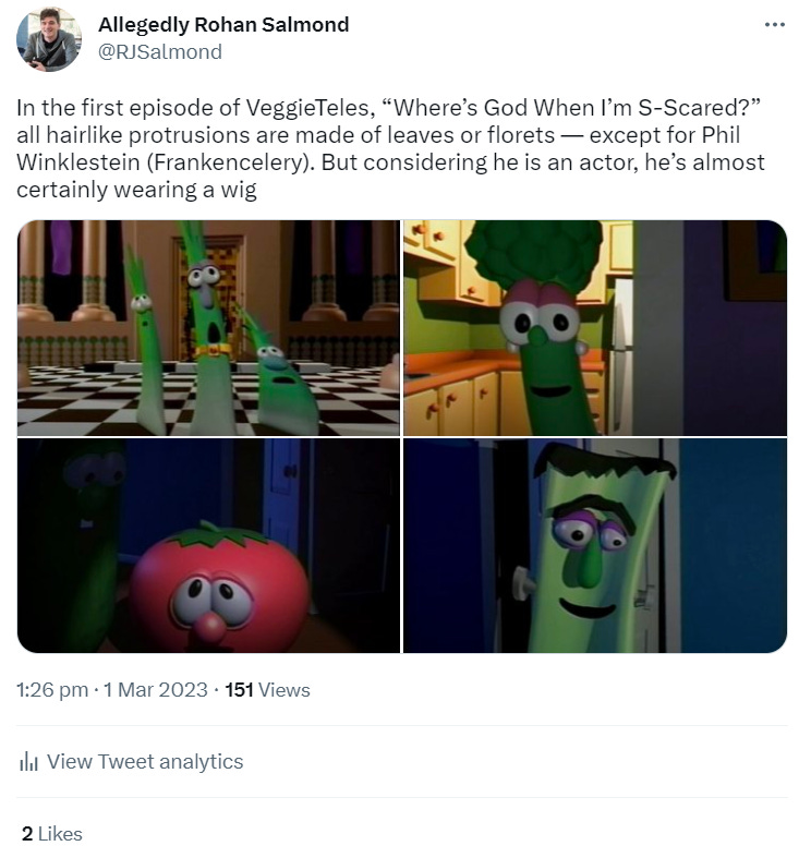 As I point out in this Twitter thread of my initial thoughts, in the first episode, “Where’s God When I’m S-Scared?” all hair on the veggies is made out of leaves or florets/asparagus tops, which makes sense, right? Later on, it’s more common to see vegetables with human-like hair.