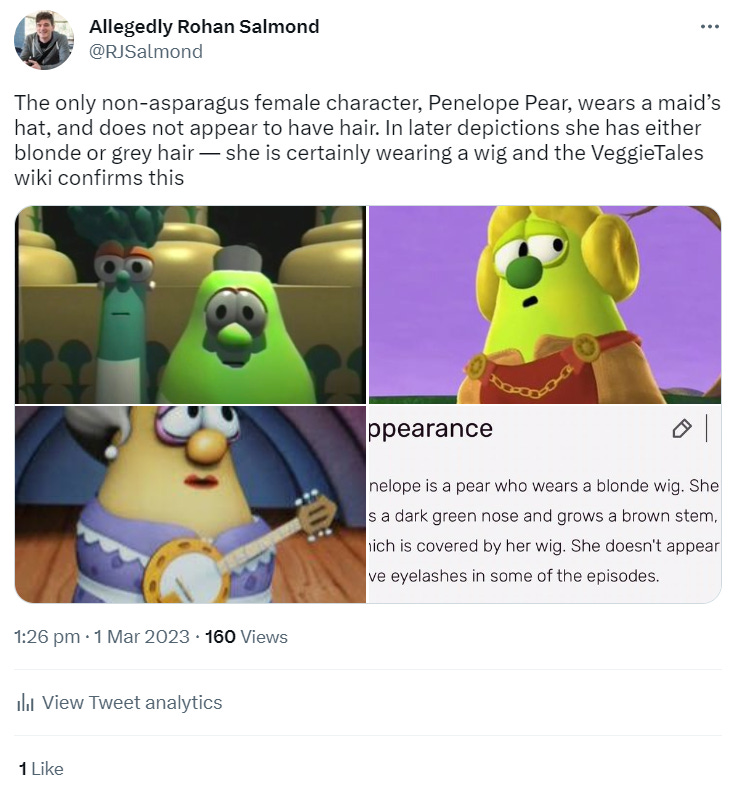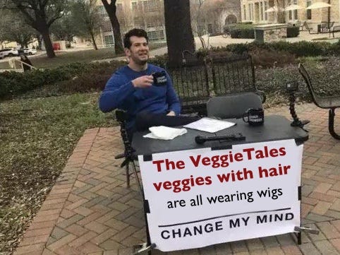 Here’s a thing I noticed yesterday that I can’t unsee: All the VeggieTales characters with human hair — particularly the female ones — look like they are wearing wigs.