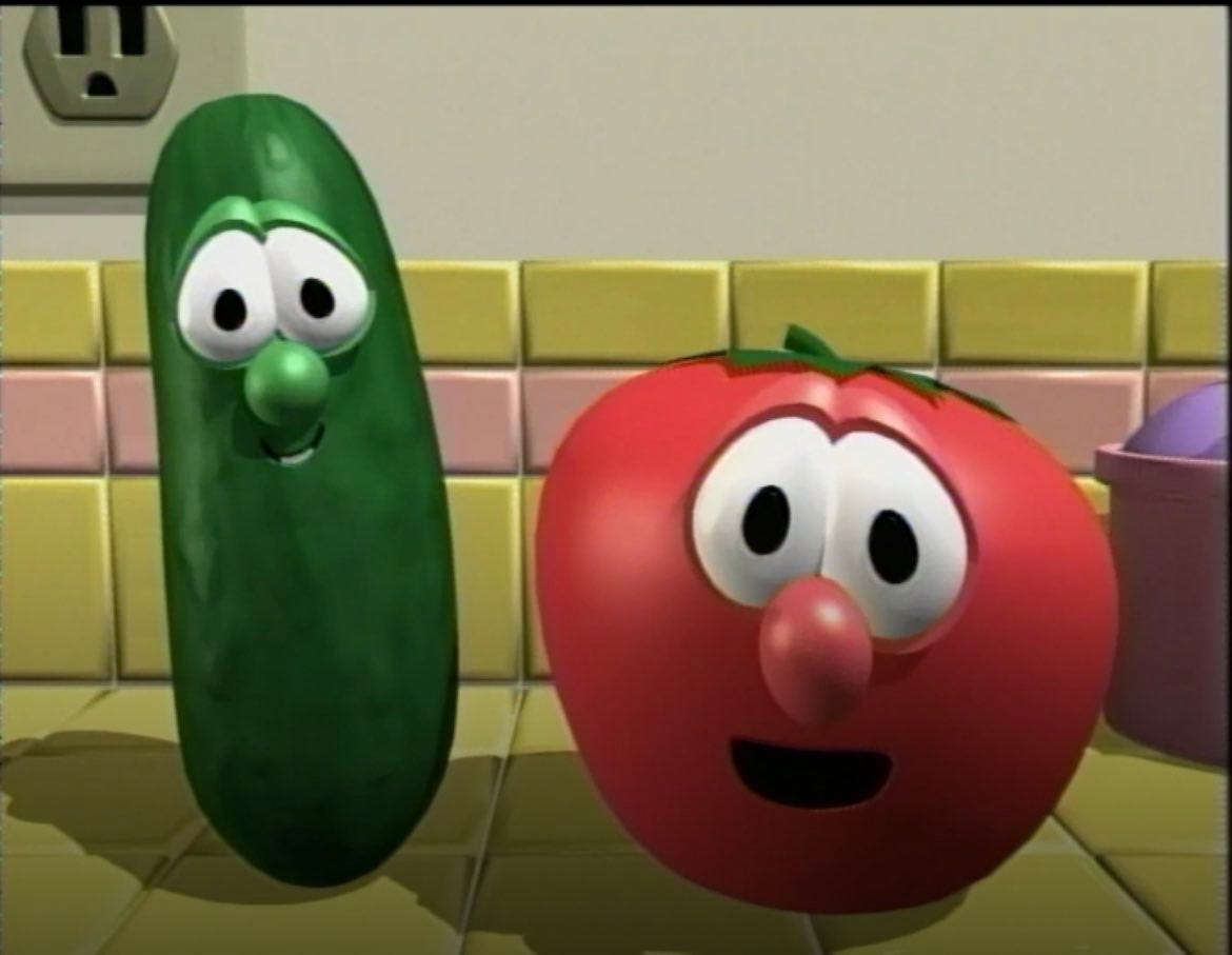 Anyway, the point is, in VeggieTales there’s the “real” part of the show and then the “story” parts where characters are often seen wearing costumes appropriate to the setting of the story they’re in. Lots of characters are mostly only seen in the story sections, but will make occasional appearances on the countertop with Bob and Larry. This makes me think they get into costume and act out the story like a church play to help the viewer imagine the story better.