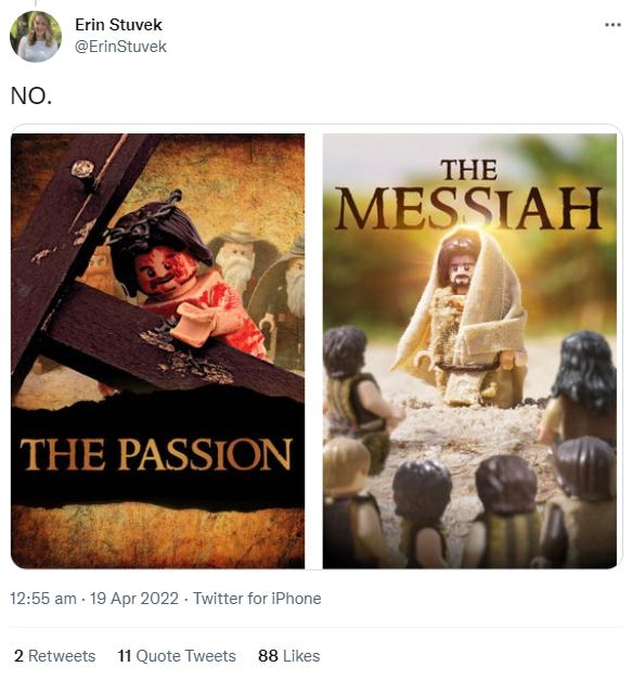Is that the same as what’s happening here? Probably, but doing absurd parody plays for Easter, with all the violence and death that’s part of that story, has sent me into the stratosphere. Here’s a Church of the Rock performance based on Back to the Future with an unusual take on the crucifixion: