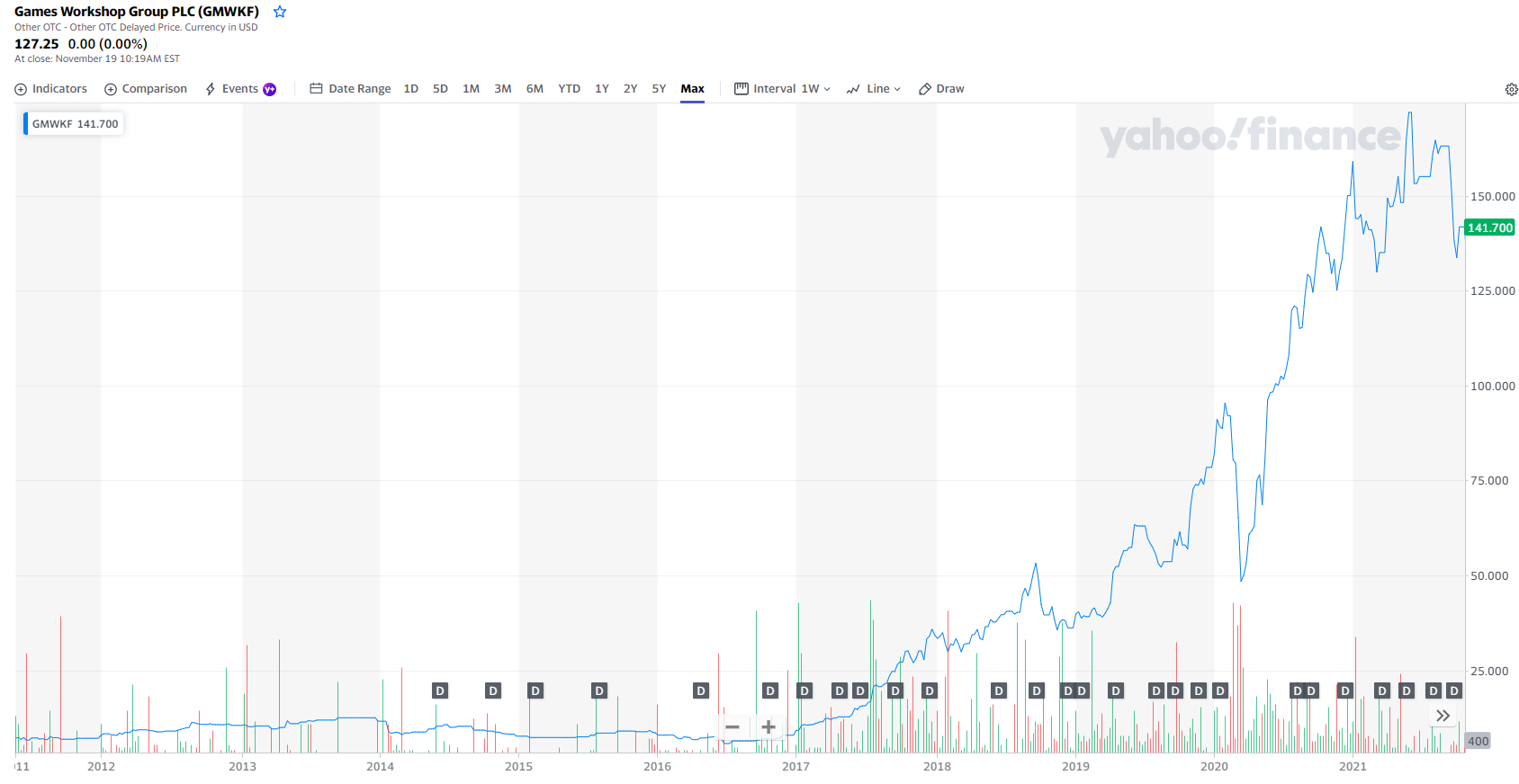 To those unfamiliar, it’s a miniature tabletop war game published by Games Workshop. It is very, very nerdy, but like lots of nerdy things right now, it has literally never been more popular (check out that share price).