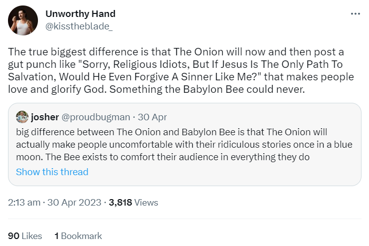 Here’s an $8 Blue Check trad with an AI-generated Elon Musk avatar on Twitter complaining about church design, or Protestantism, or the decline of Western civilisation, or repurposing abandoned pizza shops, or something. Because of the way ‘verified’ accounts get boosted on Twitter now, a lot of people saw it.