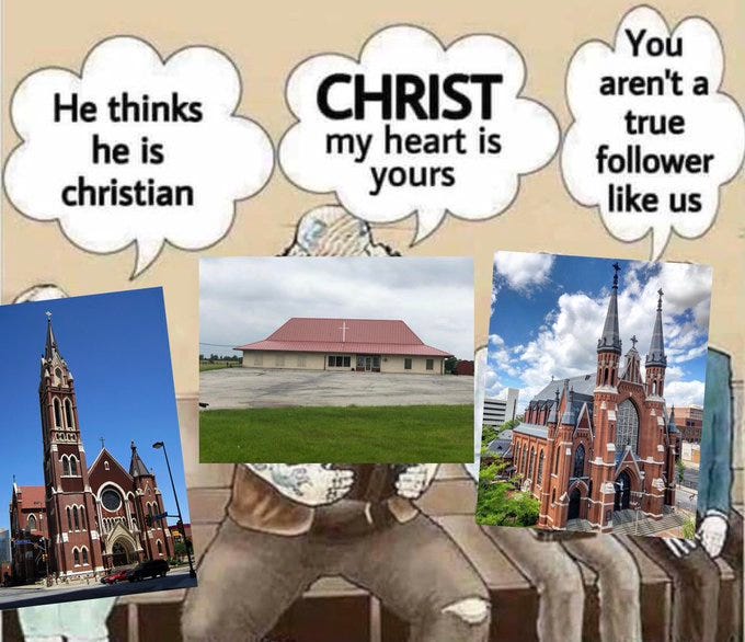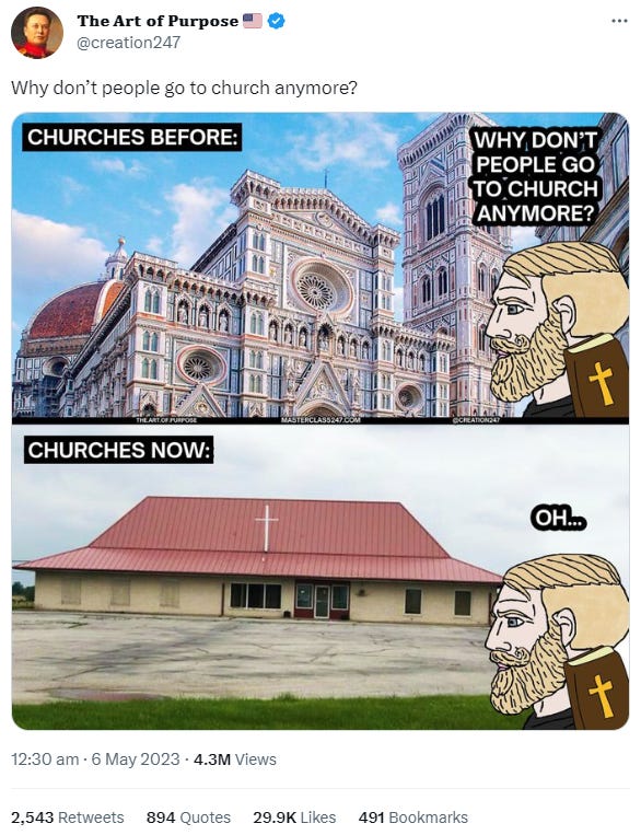 It’s funny that a lot of these guys believe people don’t go to church anymore because Christianity has “become feminised”, but also because the buildings aren’t fancy enough and some priests wear pants instead of dresses, uh I mean ecclesiastical robes.