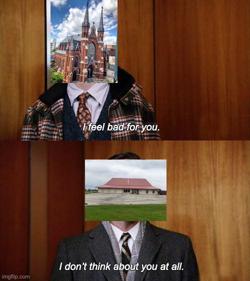 As an aside, churches in shopping malls/repurposed buildings/etc strike me as a uniquely American phenomenon. Or at least, I don’t see it happen much in Australia.