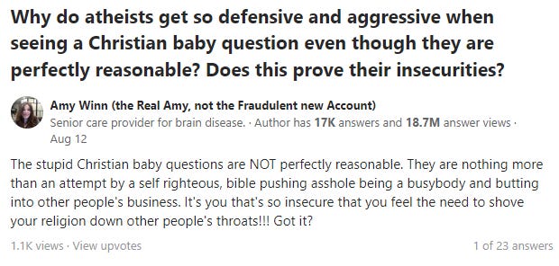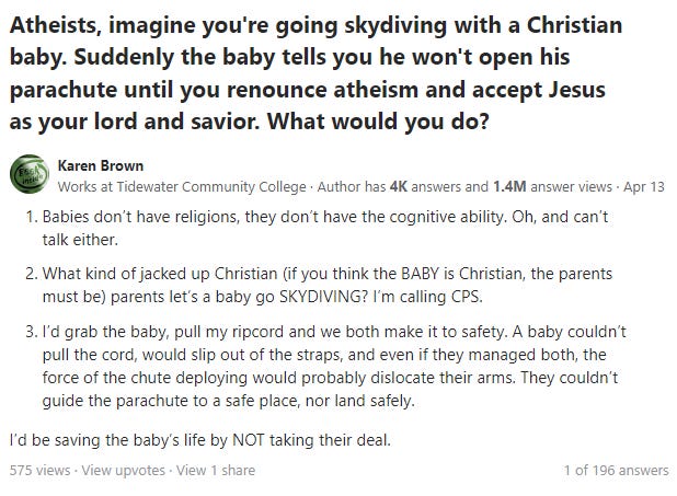 It seems impossible that it's just one person coming up with these, but maybe it is — many people answering them on Quora seem to think so. Many of them are in on the joke, but most are atheists either taking the question very seriously, or insisting it's impossible for babies to have a religion, and therefore all babies are really atheists. Expert troll.