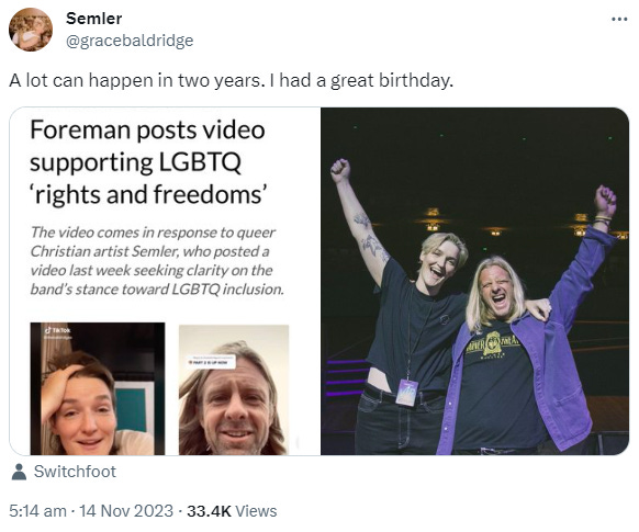 Anyway, here he is with Semler looking real happy, so I think that settles it. I love how all my favourite Christian bands from my teenage years are now queer-affirming lol I have good taste after all.